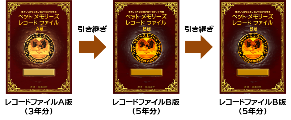 ペットメモリーズレコードファイルB版(以下、レコードファイルB版)は、ペットメモリーズレコードファイルA版(以下、レコードファイルA版)終了後、もしくはレコードファイルB版終了後に引き継ぐ記入式書籍です。