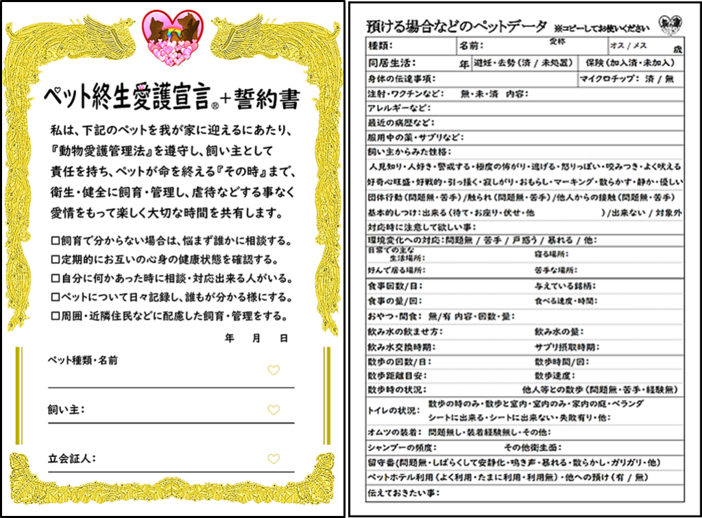 また、現在ペットを我が家に迎え入れる時、命を預かる責任や覚悟を問うモノが存在せず、結果的に虐待や放棄などが発生し社会問題になっています。本書はペット業界史上初となる、飼い主がペットの一生を責任と愛情をもって飼育する事を宣言・誓約する『ペット終生愛護宣言®+誓約書』を付けています。これをペット+飼い主+立会証人により作成してもらうことで、ペットを虐待・放棄する飼い主を減らし、ペット終生愛護を実現する活動も併せて行なっていきます。